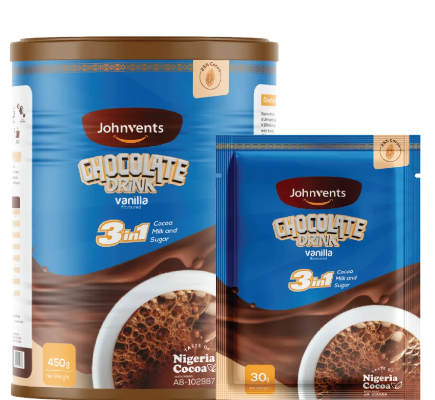 Johnvents 3in1 chocolate drink is an instant beverage mix made from rich cocoa, milk and the right amount of sugar. It is a convenient and tasty chocolate drink to enjoy. It is healthy, easy-to-make and nourishing. It is packed in tins and rolls of sachet.